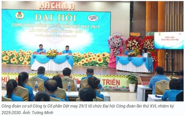 Ngày 12.11, Công đoàn cơ sở Công ty Cổ phần Dệt may 29/3 tổ chức Đại hội Công đoàn lần thứ XVI, nhiệm kỳ 2025-2030. Đến dự đại hội có ông Huỳnh Thanh Xuân - Phó Chủ tịch Tổng Liên đoàn Lao động Việt Nam cùng lãnh đạo Liên đoàn Lao động thành phố Đà Nẵng.